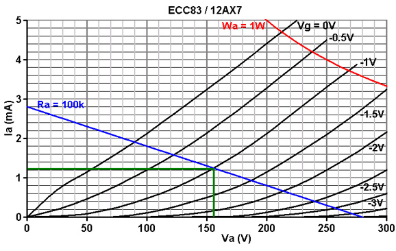 Next choose a bias point in the usual way. In this case -1V looks good, for a quiescent anode current of 1.2mA.